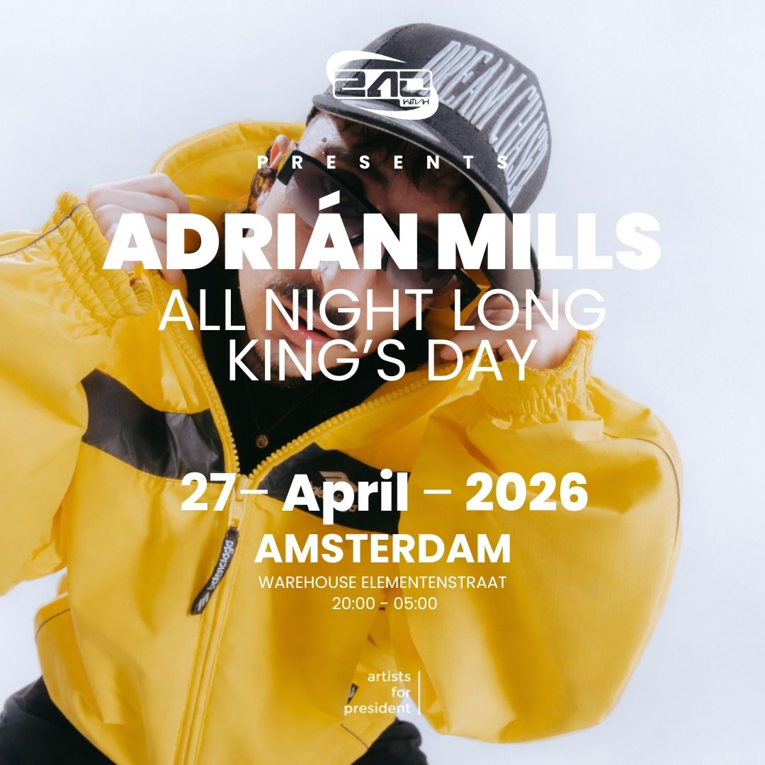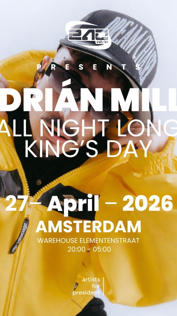Adrián Mills gears up for his first all-nighter in Amsterdam. Presented by 240KMH and Artists for President, this special Kingsday event will bring his signature sound and energy from start to finish. Expect many guests and surprise back-to-backs sliding into the booth throughout the night.