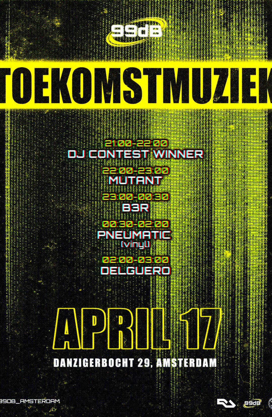 99dB hard launch their collective with a big techno night at Toekomstmuziek! With a carefully curated lineup mixing newcomers and experienced Amsterdam DJs, expect tight grooves, danceable funky techno and energy that builds the whole night.