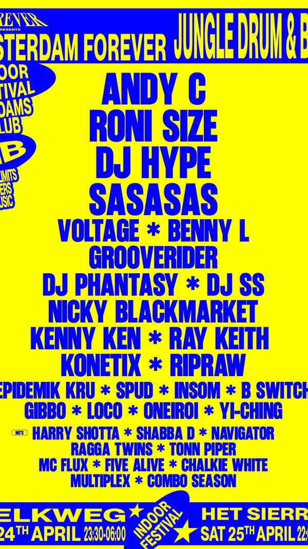 Amsterdam Forever — Indoor Festival Melkweg, Amsterdam · Friday 24 April 2026 · 23:30–06:00 Amsterdam Forever lands at Melkweg for the opening night of the King's Day Weekender — a full indoor festival across two arenas in one of Europe's most iconic clubs. The Jungle & Drum and Bass Arena brings together some of the biggest names in the culture: Andy C, Grooverider, Benny L, DJ SS, Kenny Ken, Nicky Black Market, Sasasas and DJ Ollie, with MCs Harry Shotta, MC Shabba D, Navigator, Tonn Piper, Multiplex and Combo Season. The Hardcore & Old Skool Arena features Hixxy, Slipmatt, Force, DJ Slay and Jay Switch, with MCs Charlie B and Deecee. The night kicks off a three-day weekender across Amsterdam's most celebrated venues, boat parties on the canals and secret pop-up locations — all timed to coincide with King's Day, the most extraordinary street party on the planet. Doors 23:30. Single night tickets from £39. Full info: amsterdamforever.com