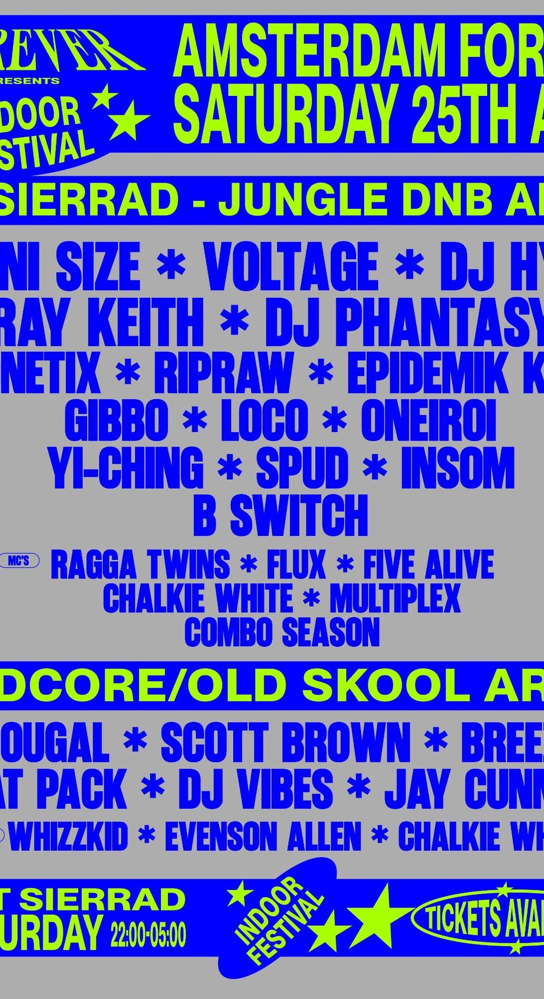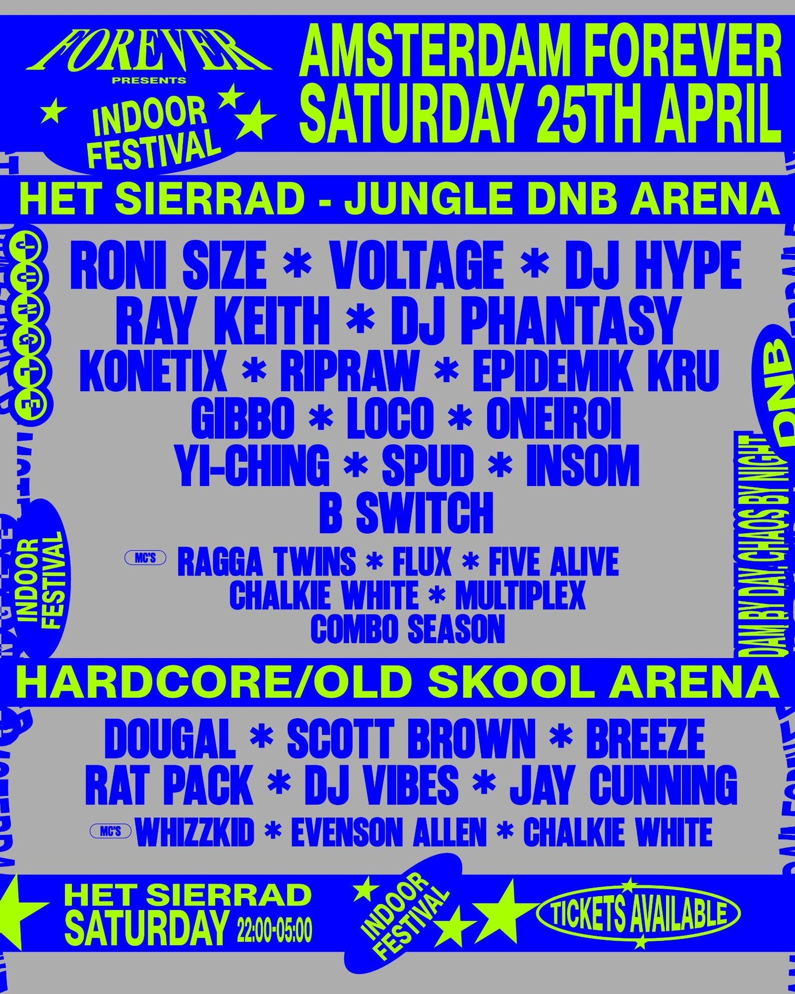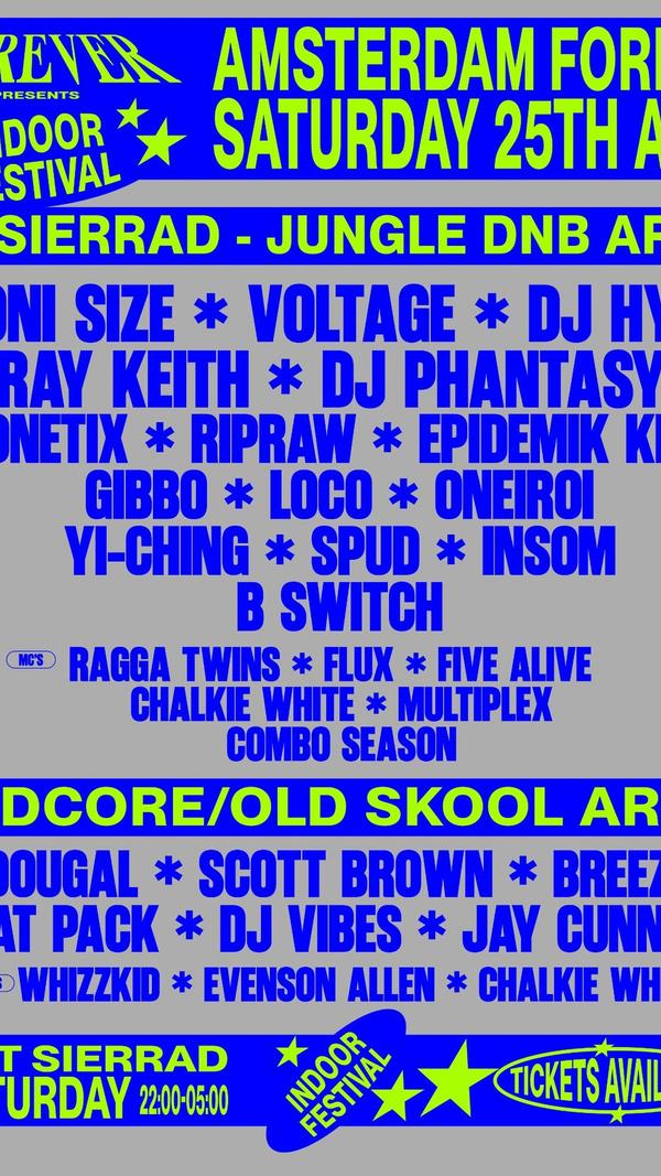 Amsterdam Forever — Indoor Festival (Saturday) Het Sieraad, Amsterdam · Saturday 25 April 2026 · 22:00–05:00 Night two of Amsterdam Forever takes over Het Sieraad — a stunning former school building in Amsterdam West with two rooms, high ceilings and world-class production — for the biggest night of the King's Day weekend. The Jungle & DNB Arena features Roni Size, DJ Hype, Voltage, Ray Keith, DJ Phantasy, Konetix, Ripraw, Epidemik Kru, Gibbo, Loco, Oneiroi, Yi-Ching, Spud, Insom and B Switch, with MCs Ragga Twins, Flux, Five Alive, Chalkie White, Multiplex and Combo Season. The Hardcore & Old Skool Arena features Dougal, Scott Brown, Breeze, Rat Pack, DJ Vibes and Jay Cunning, with MCs Whizzkid, Evenson Allen and Chalkie White. Weekend tickets from £99. Single night tickets from £39. Full info and tickets: amsterdamforever.com