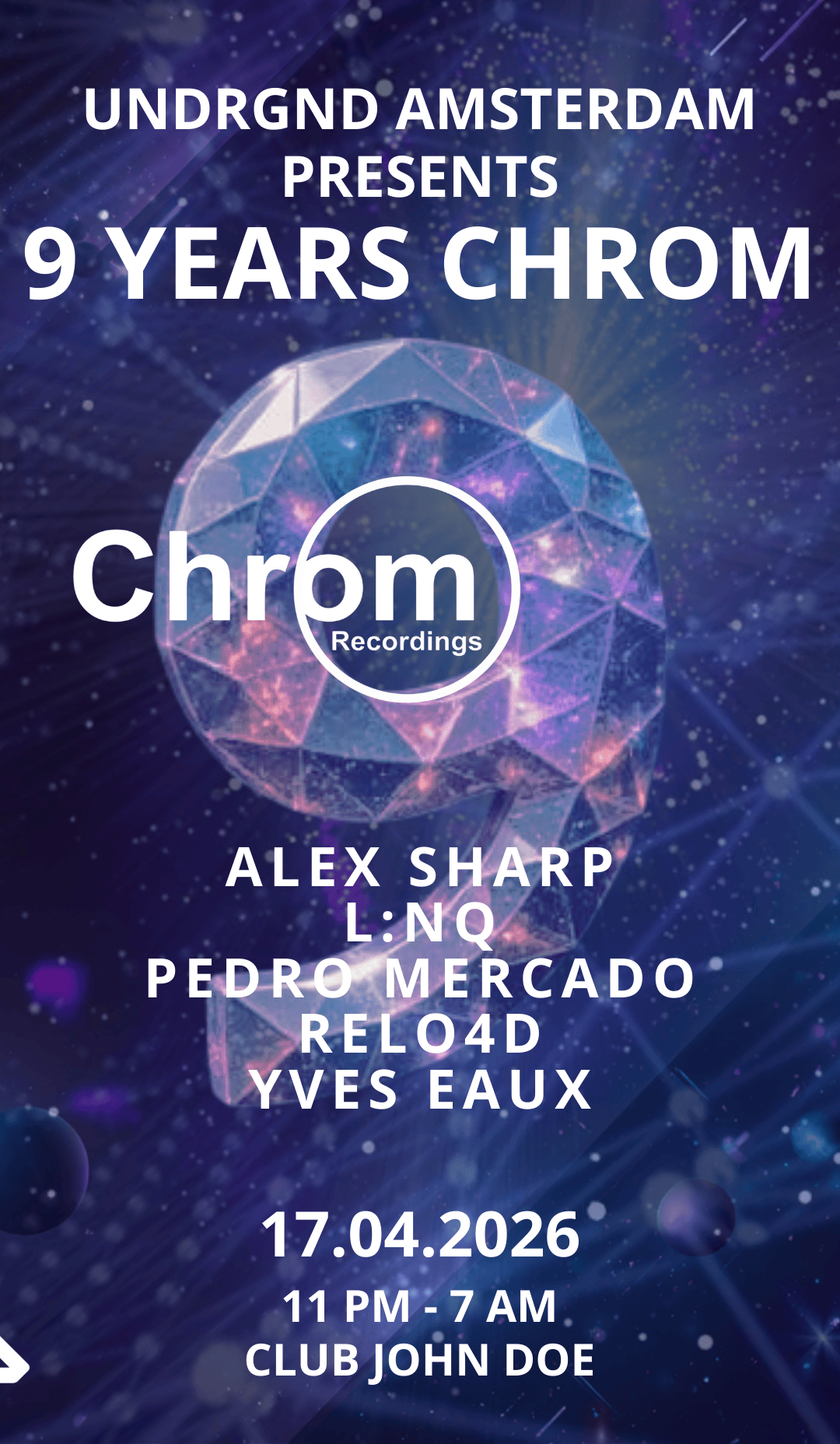 Nine years of Chrom, depth & soul. On April 17, UNDRGRND celebrates 9 years of Chrom Recordings — a night built on everything the label stands for: raw energy, melodic depth, and a community that keeps showing up. Born in Ibiza. rooted underground. Nine years of releases, showcases, and moments that hit different. ------LINEUP------ - Alex Sharp - L:NQ - Pedro Mercado - Relo4d - Yves Eaux Date: April 17, 2026 Time: 23:00 - 07:00 Location: Club John Doe, Rembrandtplein 31