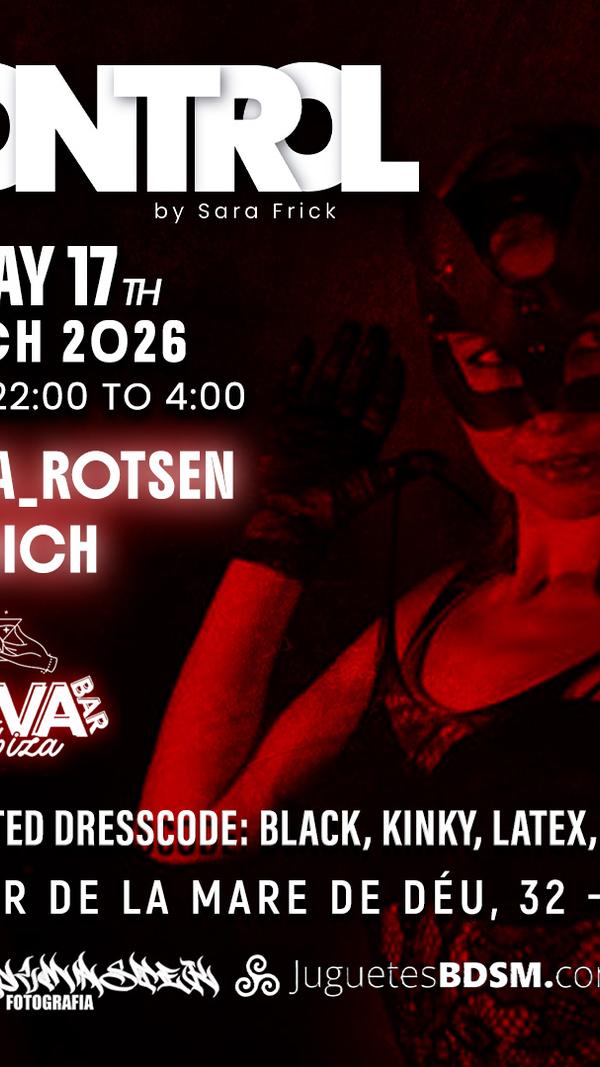 **CONTROL BY SARA FRICK** **VIERNES 17 DE ABRIL 2026** **VIVA BAR IBIZA** En pleno corazón del puerto de Ibiza, descendemos de nuevo a la cueva. CONTROL regresa este viernes a su ubicación habitual en la emblemática calle peatonal del centro para transformar el espacio en un refugio de electrónica auténtica. Desde nuestra llegada en febrero, hemos consolidado un punto de encuentro donde el sonido y la atmósfera se funden en una experiencia de club real. Para esta sesión, la cabina estará bajo el mando de **GUGA_ROTSEN** y **COMICH**. Contamos con el directo y la producción de Guga Rotsen, quien aportará su visión personal y su energía como creador de sonidos, junto a la experiencia y el criterio de Comich, un artista que entiende la pista de baile desde la profundidad y la técnica. Prepárate para una noche de Techno y ritmos electrónicos diseñados específicamente para la fisionomía de nuestra sala. Bajos contundentes y una selección musical que huye de lo comercial para centrarse en la energía del auténtico underground. **IDENTIDAD Y FLUJO DE LA NOCHE:** La estética de CONTROL es la pieza clave para generar esa energía especial que se respira en la cueva. Para que el flow de la noche sea total, invitamos a todos los asistentes a venir vestidos, como mínimo, de color negro. Nuestra comunidad se caracteriza por experimentar con texturas como el látex, el cuero o la lencería, elementos que agradecemos y fomentamos para potenciar la personalidad de la fiesta. No obstante, dada nuestra ubicación en el centro peatonal de Ibiza, permitiremos el acceso como excepción a aquellos que se acerquen a conocernos por primera vez o turistas que transiten por la zona, siempre que se mantenga el máximo respeto por el ambiente que hemos construido. Venir de negro es la mejor forma de integrarse y sumar a la estética de CONTROL. **DETALLES DEL EVENTO:** * **Lugar:** Viva Bar Ibiza. Nuestra cueva en el centro de la isla. * **Dirección:** Carrer de la Mare de Déu, 32. * **Acceso:** Entrada gratuita hasta completar aforo. * **Horario:** De 22:00 a 04:00 horas. Te esperamos este viernes en el centro de Ibiza para vivir una noche de electrónica sin filtros. Baja a la cueva y toma el control.