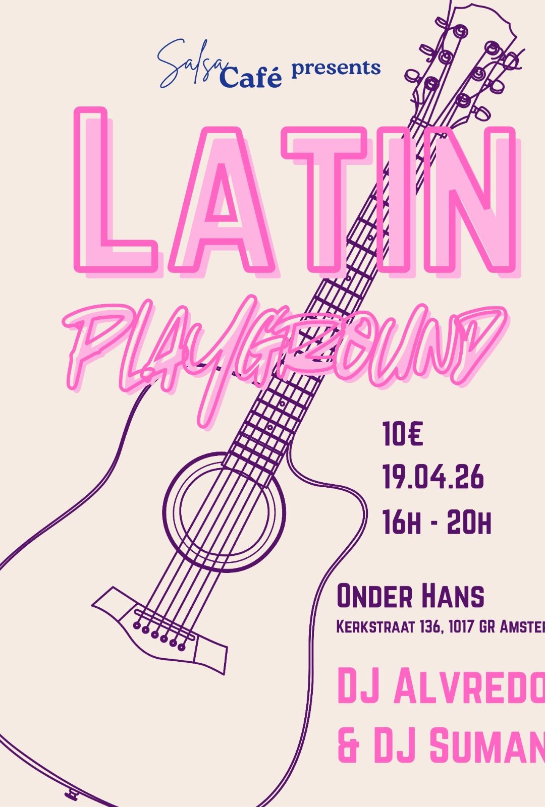 Join the 9th edition of Latin Playground at Onder Hans in Amsterdam! Enjoy a vibrant Sunday afternoon filled with salsa and bachata dancing, featuring energetic sets from DJ Suman and DJ Alvredo.