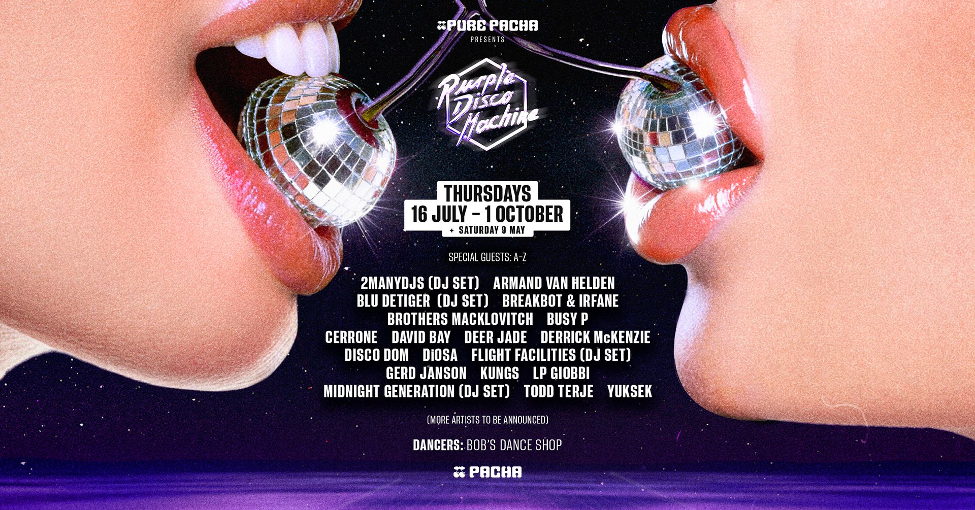 Experience the vibrant energy of Pure Pacha at Pacha Ibiza with GRAMMY-winning Purple Disco Machine. Enjoy a night of uplifting, funk-led modern disco-house alongside Kungs and David Bay on Ibiza's most legendary dancefloor.