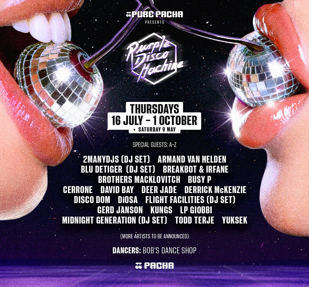 Pure Pacha, the celebrated party with over 20 years of history, renowned for its elegant, feel-good atmosphere and vibrant energy, presents Purple Disco Machine this season at Pacha Ibiza. A worldwide leading force in modern disco-house, he brings his funk-led, uplifting sound to Ibiza’s most legendary dancefloor. With international hits like Hypnotized, a GRAMMY Award and over 1.5 billion streams, this residency promises irresistible grooves, timeless disco emotion and the unmistakable spirit of Pure Pacha.